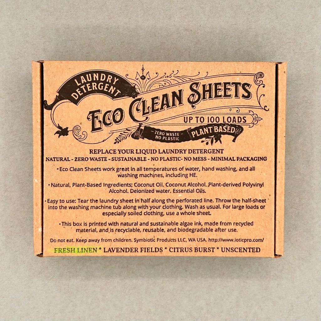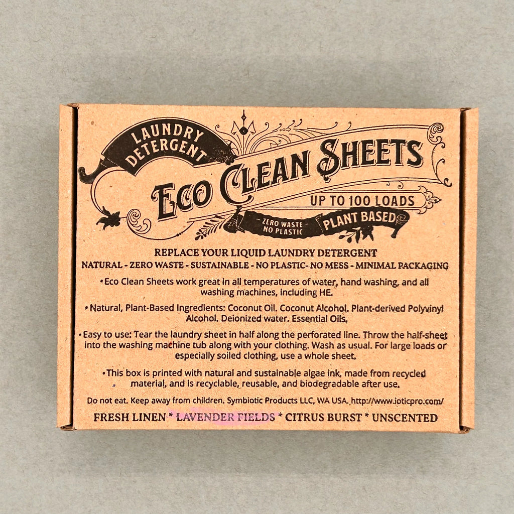 An easy and inexpensive way to go green. Eco Clean Sheets ship in a recycled storage box that will take up minimal room in your laundry room. Now printed with 100% sustainable Algae Ink!
