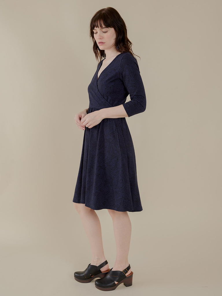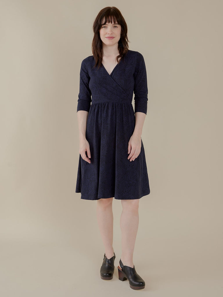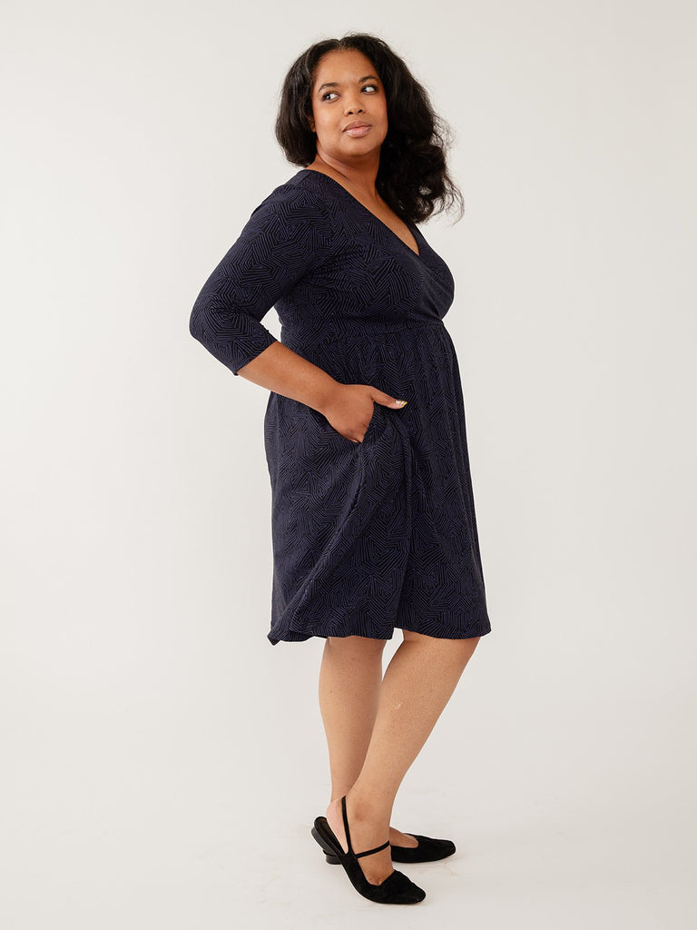 Callie checks all the boxes on the Mata favorites list: fit & flare dress, comfy organic cotton jersey, and pockets. We know you love pockets! From workwear to nights on the town, this wrap dress is ready to be your new favorite. Style with some dangly earrings to add a little extra shine to your outfit.