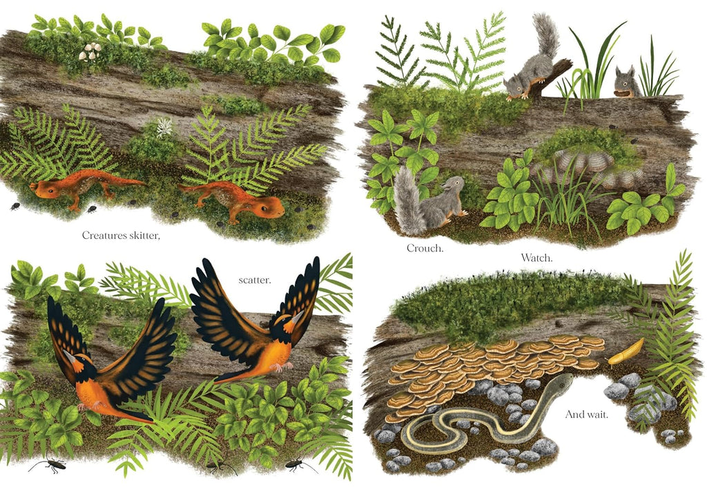 Three intrepid young female explorers set out to conquer the outdoors in their local forest, enjoying the process in their own different ways. Wren brings a sketchbook and a flag, El brings a poetry notebook, and Hattie brings feathers (and holds Bean the dog’s leash). They get lost and use maps to find their way. They draw wildlife, spot deer tracks, and see a deer before it startles and disappears, all before they finally and joyfully reach their destination.