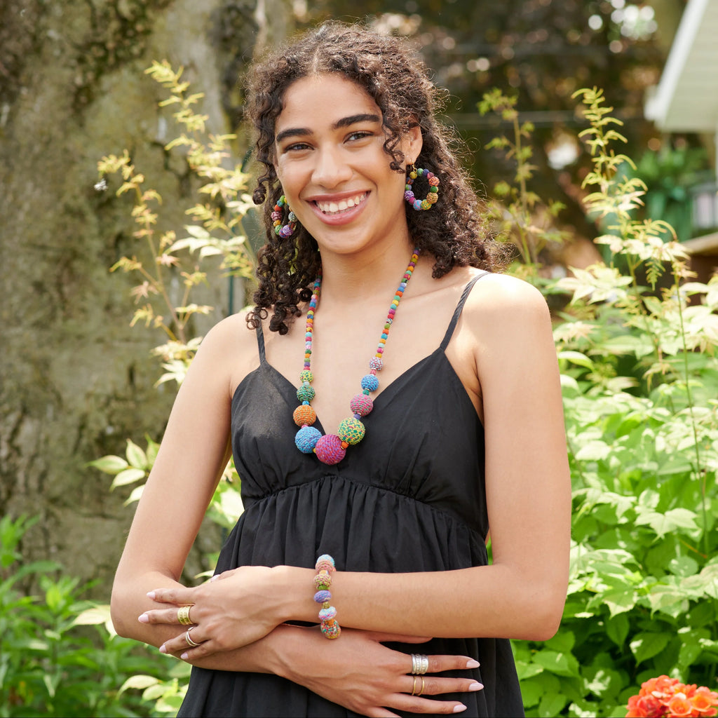 This favorite silhouette features round Kantha beads that graduate larger toward the center, and then taper going up towards the clasp. The colorful beads are linked together with brass wire to create a super fluid style.