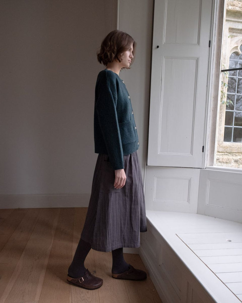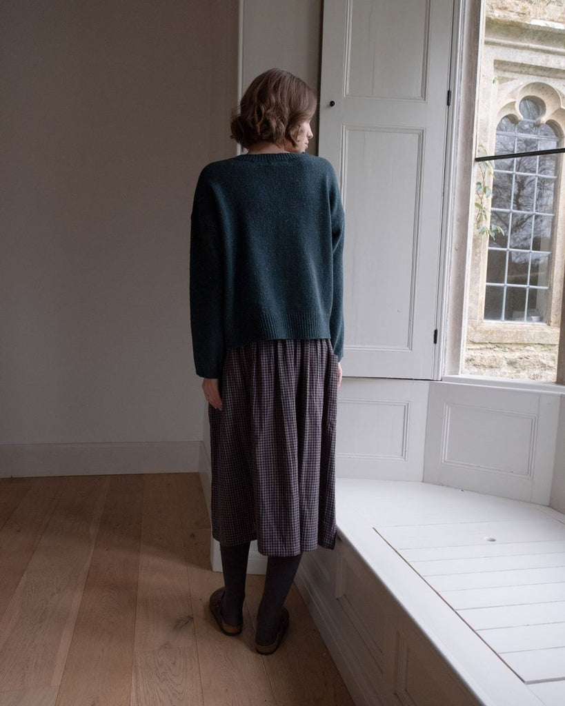 A pull-on skirt with a fully elasticated waistband made in soft, double gauze cotton with a small weaved check. This is an easy-to-wear wardrobe staple for everyday comfort wear. Simple, comfortable style that you’ll wear year after year. This piece has a fully gathered skirt and is finished with two convenient large patch pockets.