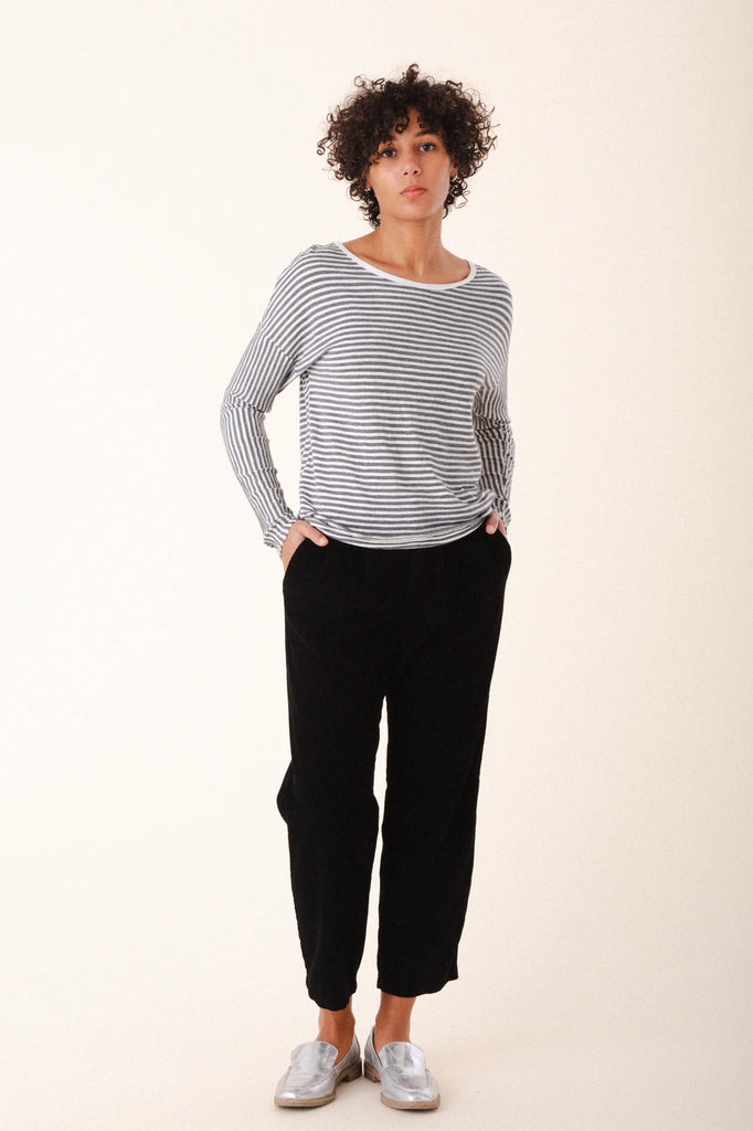 The stripes on this tee, have been cut to form an endless horizon, creating a feeling of expansiveness and motion. It is a complex cut, rigorously minimal, and with a gestural impact. Designed to be worn routinely, this clean, wide-neck tee is a layer in winter months and a perfect t-shirt for the rest of the year.
