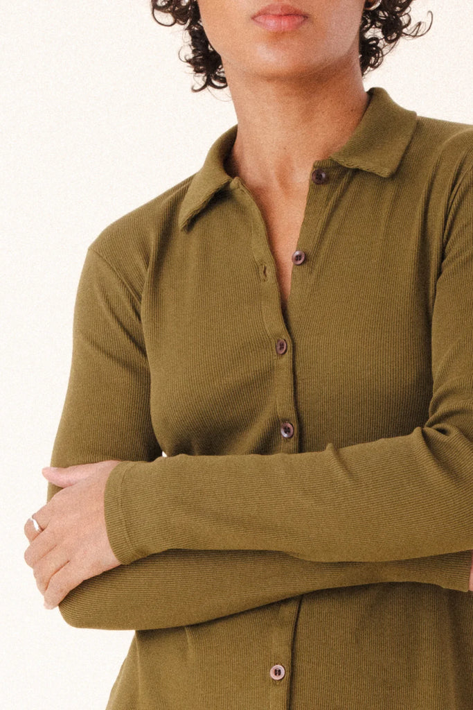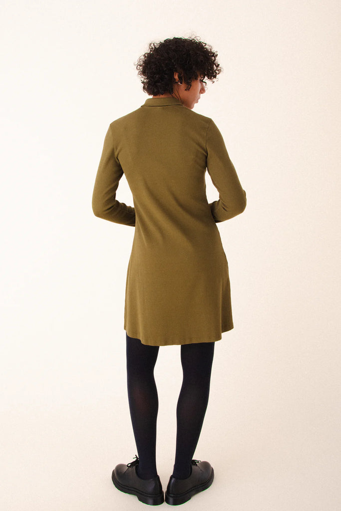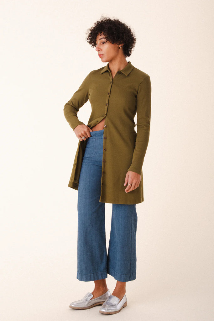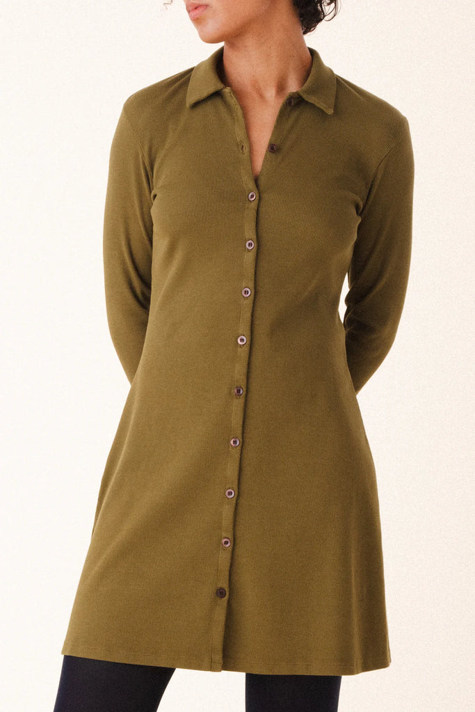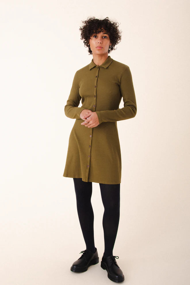 The body-skimming rules of equestrian style have been expanded in this thick rib button-down dress. Carefully placed buttons and long sleeves extend the seasonless possibilities for wear. Whether worn alone in late Summer or over jeans and tights in the winter, this dependable dress is poised and tailored and ready to style in a manner that suits your mood.