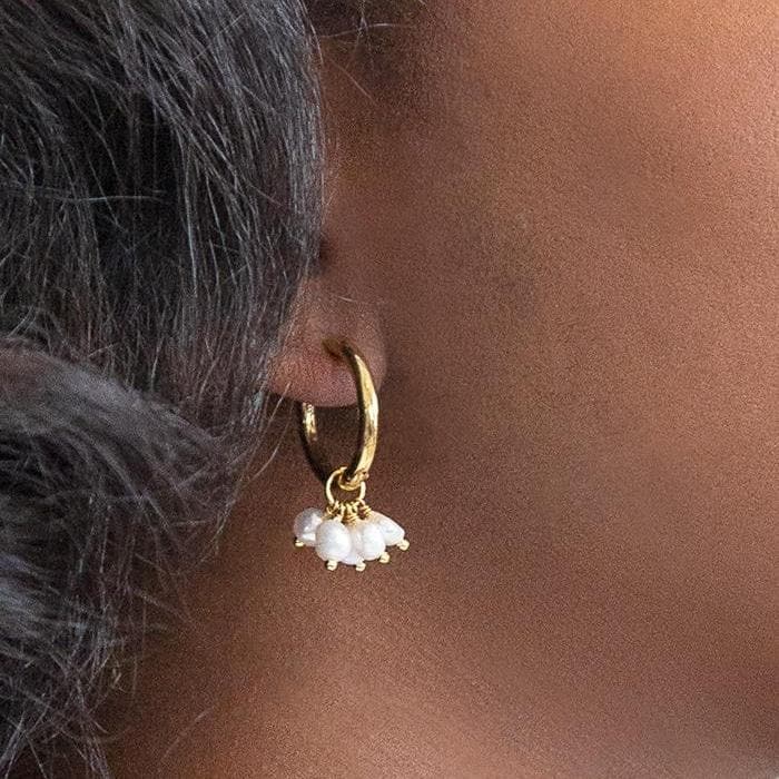 A new twist to huggie earrings – this hoop huggie features a cluster of freshwater pearls, which is a customer favorite that is sure to please.