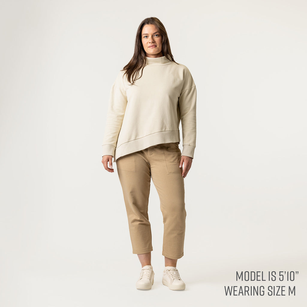 Snuggle into this soft, warm French Terry top featuring a fun mock neck and a funky asymmetrical hemline. Its relaxed fit is a perfect match for pants, skirts or your favorite leggings. Garment dyed for that effortlessly worn-in charm. Made entirely from 100% Regenerative Organic Certified Bronze Cotton.
