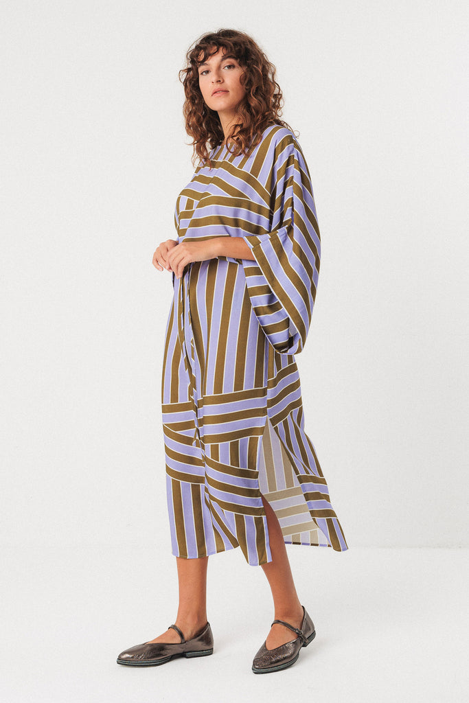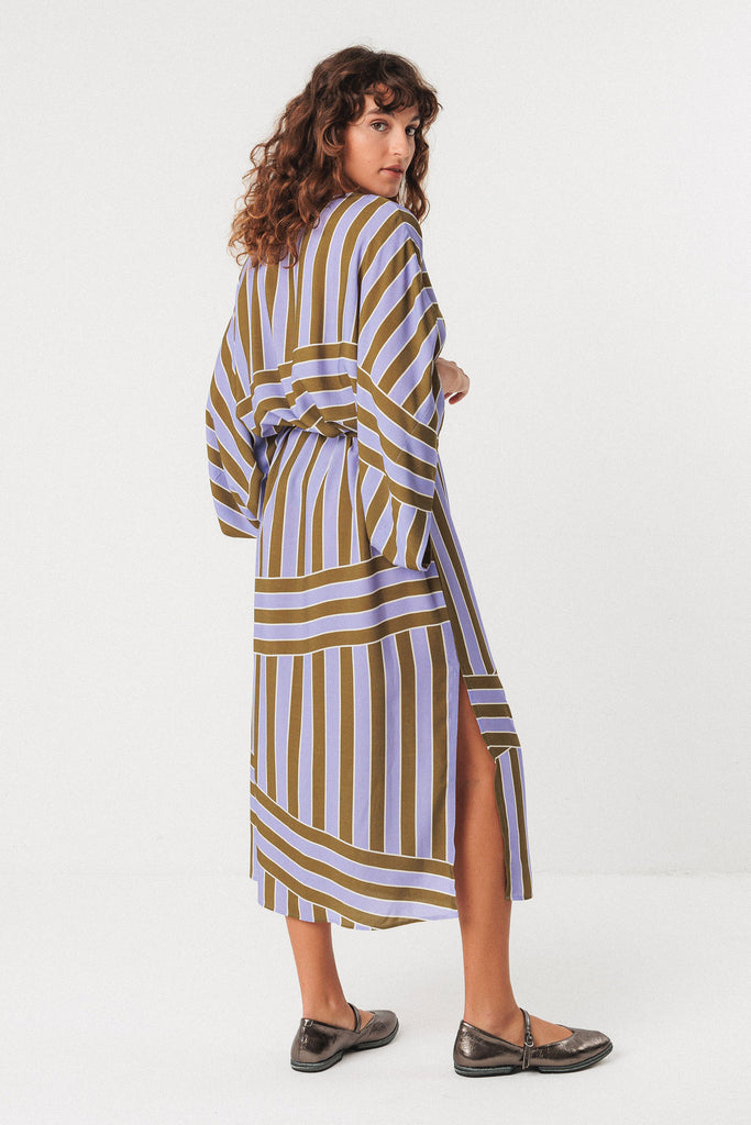 This sophisticated midi-length slip-on dress features varying stripe patterns unique to each fabric cut, ensuring every piece is one of a kind. Designed for effortless wear, it blends style with simplicity.