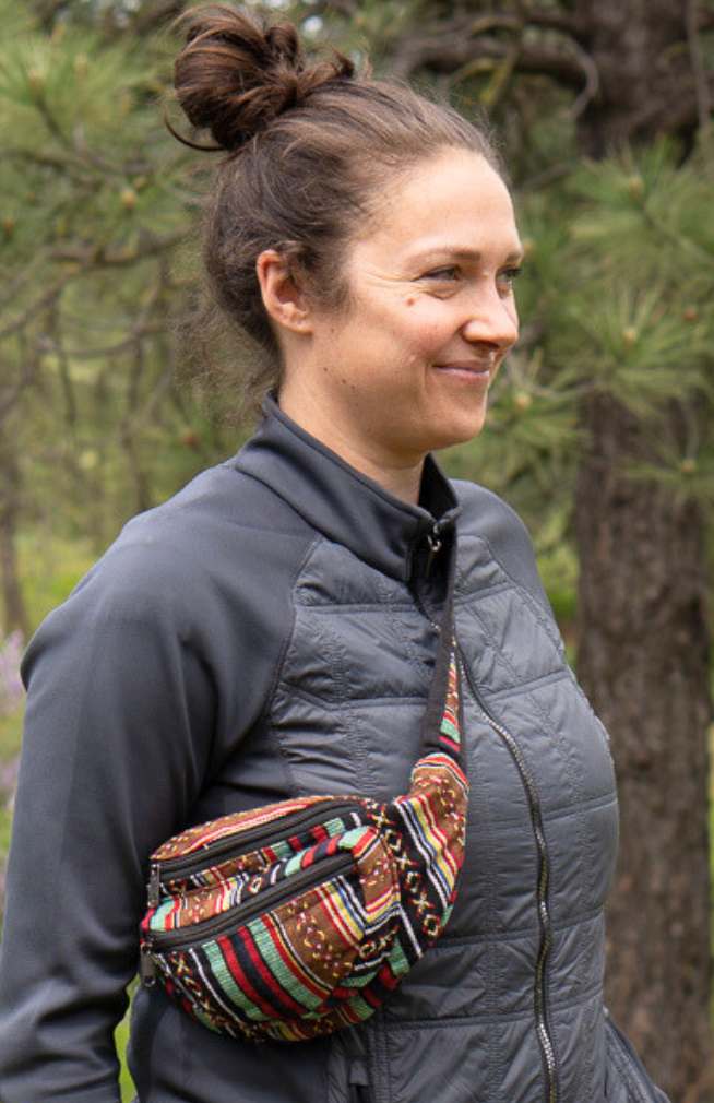 This colorful cotton gyari bag is the perfect small size to meet all of your minimalistic needs. It features an adjustable buckle strap and can be worn as a sling bag or a fanny pack.